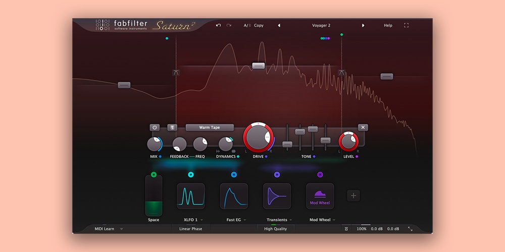 EQとサチュレーションが連動していて、同様にニュアンス作りをする場合は足した分、引く必要があります。また、Saturn 2と同様に音量は手動で調整する必要があります。