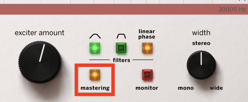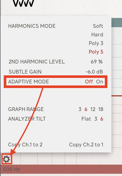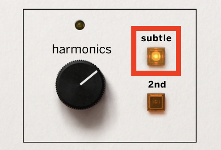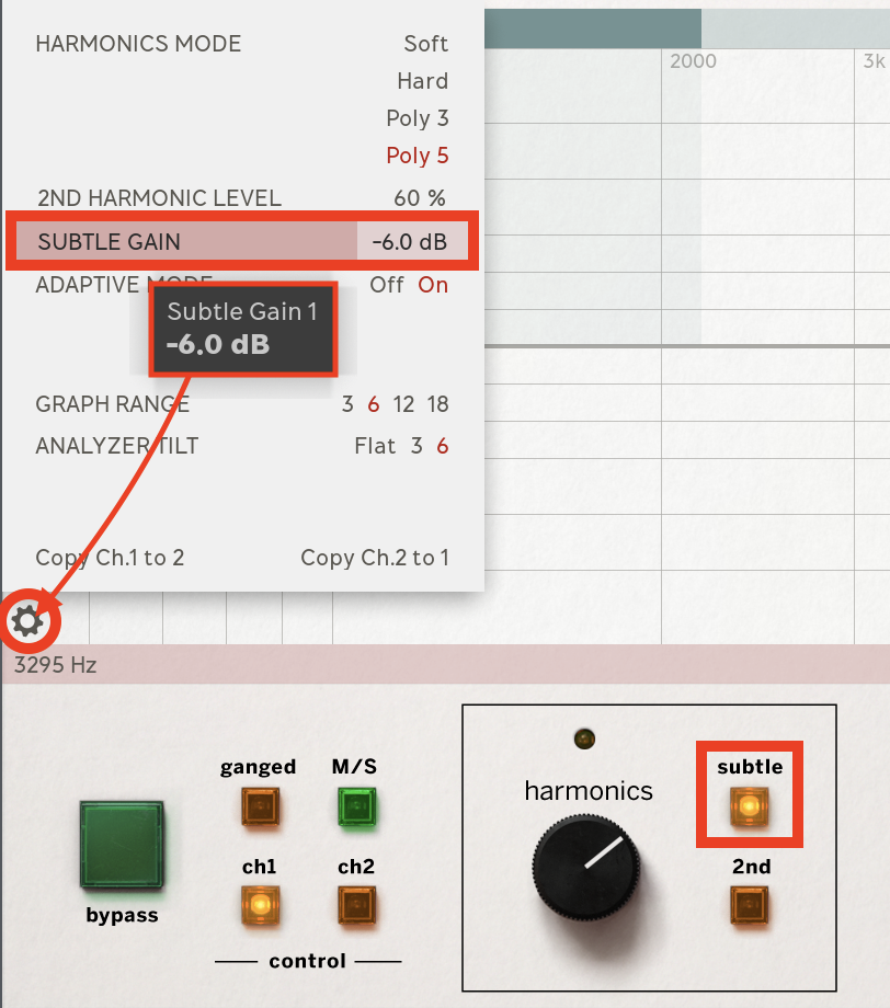 - 倍音ジェネレーターのゲインを下げます。ゲイン量は左下の歯車のSubtle Gainから設定できます。(デフォルトは-6dB)