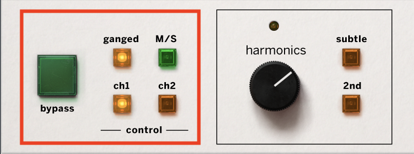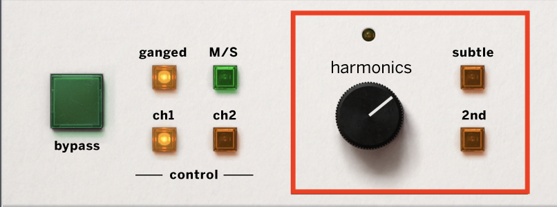 - ONにすることで、内部チャンネル設定を通常の左右(Left/Right)からミッド/サイド(Mid/Side)に切り替えます。これにより、ハーモニクスはミッドチャンネルとサイドチャンネルから生成されるため、Gangedがオフの場合でもチャンネル処理に影響します。