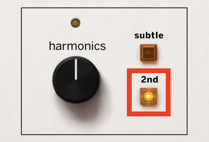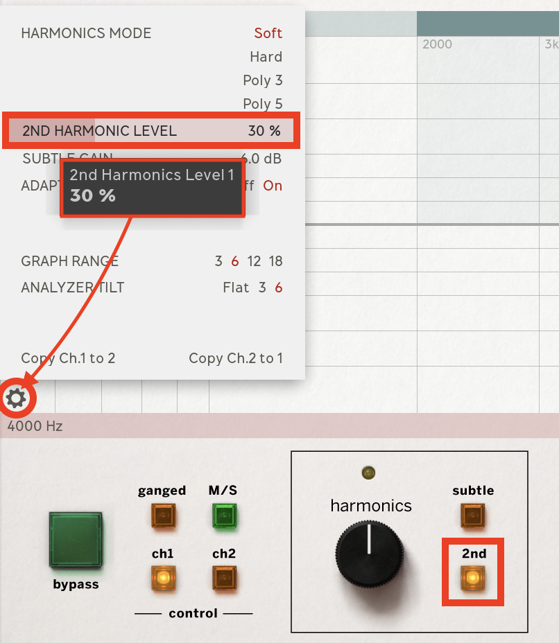 - 偶数次倍音を生成します。偶数次倍音の量は、左下の歯車の2nd Harmonic Levelから設定できます。(デフォルトは30%になっているので、差が分かりづらいです。)