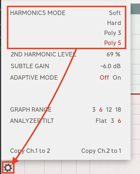 予測可能な結果をもたらすSoft/Hardと、透明性にフォーカスされた倍音生成をするPoly 3/Poly 5の4種類から倍音生成のアルゴリズムを選択できます。