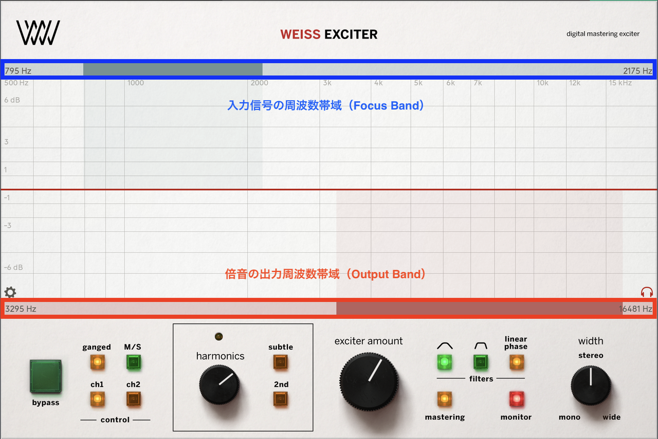 - 入力信号のどの帯域から倍音を抽出するかを指定