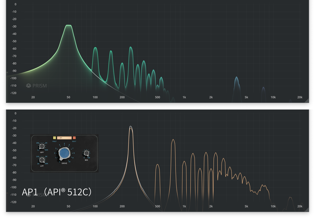 | 「API®の音 = Fast, punchy, mid-forward, in-your-face」とよく表現される。 | Driveを上げると入力トランス由来の微かな歪みと厚みが付加され、音がより太く攻撃的になる。 |