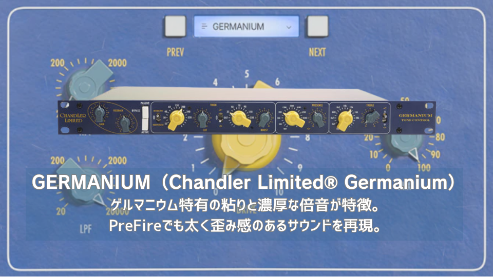 | Chandler® Germanium Preampは、ビンテージのゲルマニウムトランジスタを使用したユニークなプリアンプで、非常にカラーの濃いサウンドが持ち味。 | PreFireのGERMANIUMモデルは、Chandler® Germanium プリアンプの色濃いキャラクターを非常によく捉えている。 |