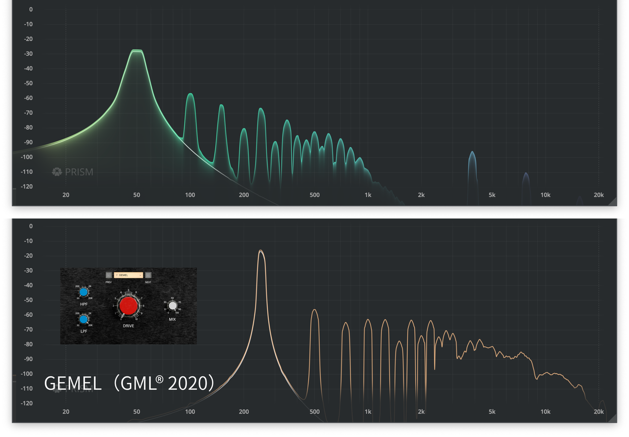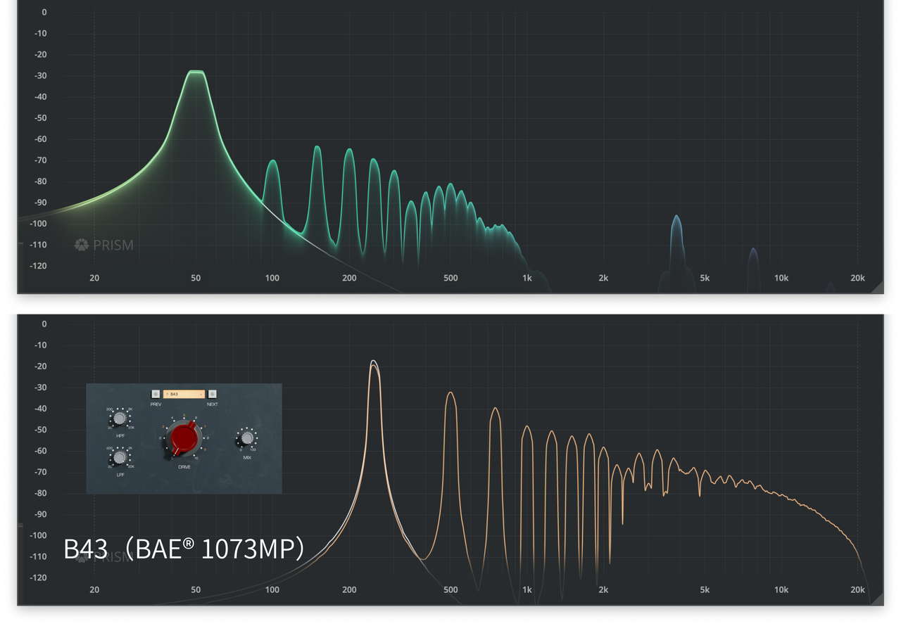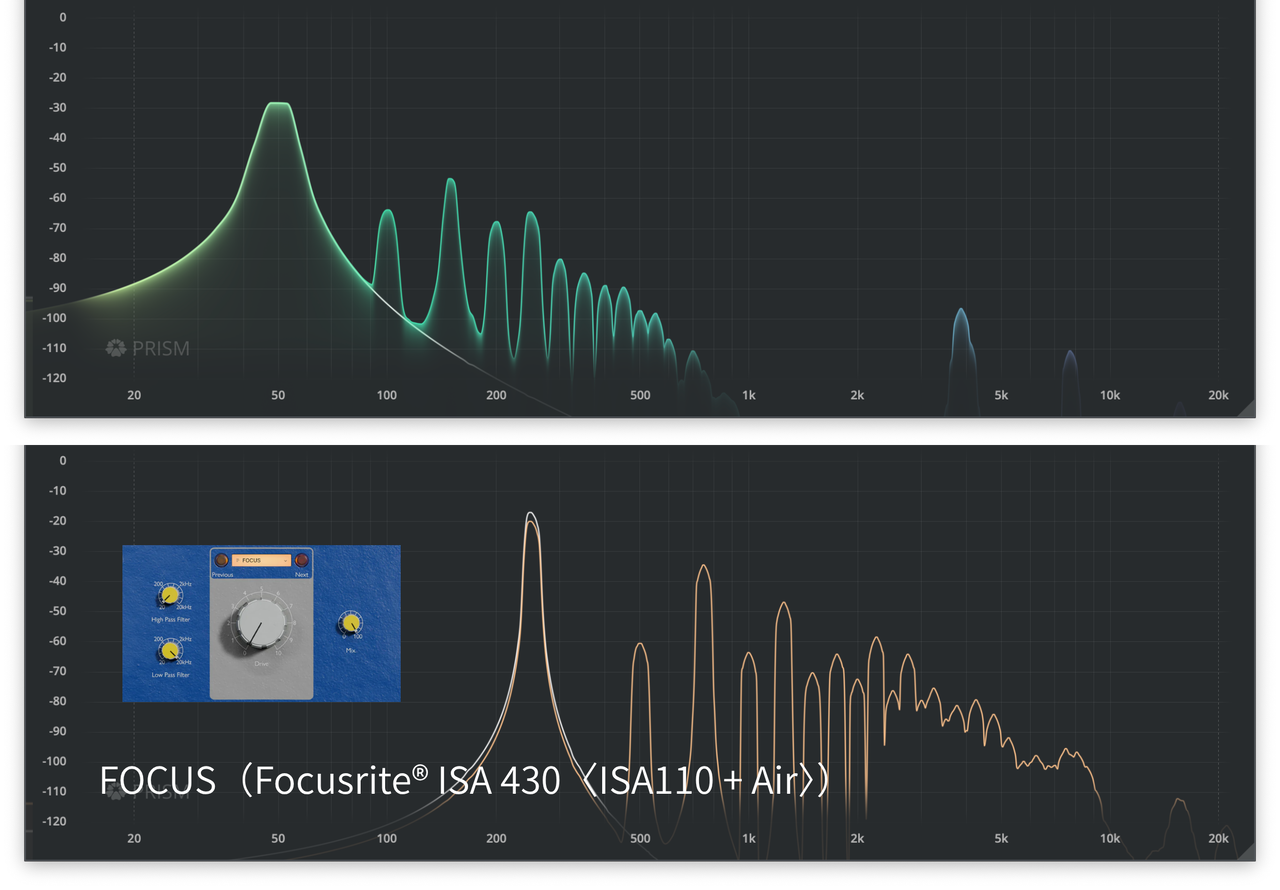 | 音に太さと色付けを与え、ボーカル、エレキギター、ドラムなどをリッチな「レコードで聴くような音」にする。 | 高いDrive設定でわずかなエイリアシングが発生する報告もあるが、通常使用ではアナログ同様の滑らかなサチュレーションが得られる。 |