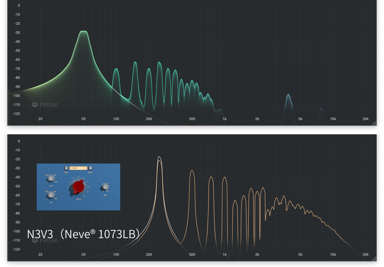 | 高域は12kHz付近がわずかに持ち上がったような「滑らかな輝き」があり、音を丸くしつつも抜けを良くする。 | PreFireのNeve®系モデル(N3V3およびB43)は「非常に良く出来ており、実機と遜色ない」と評価されている。 |