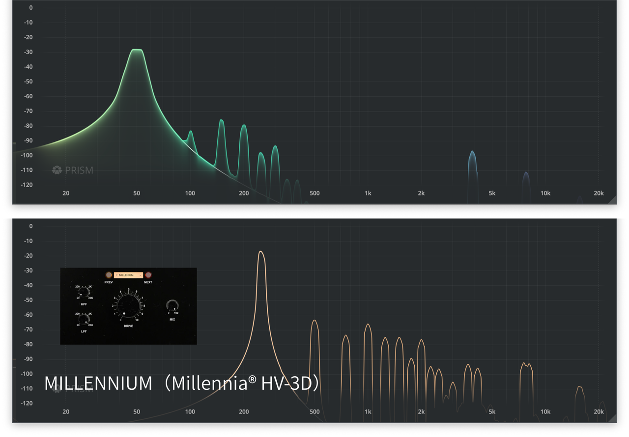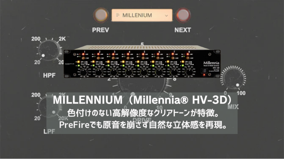| Millennia® HV-3シリーズは、オーディオ業界で最も透明なマイクプリの一つとして知られている。 | PreFireのMILLENNIUMモデルは、Millennia® HV-3Dの超高透明度サウンドを忠実にモデル化している。 |