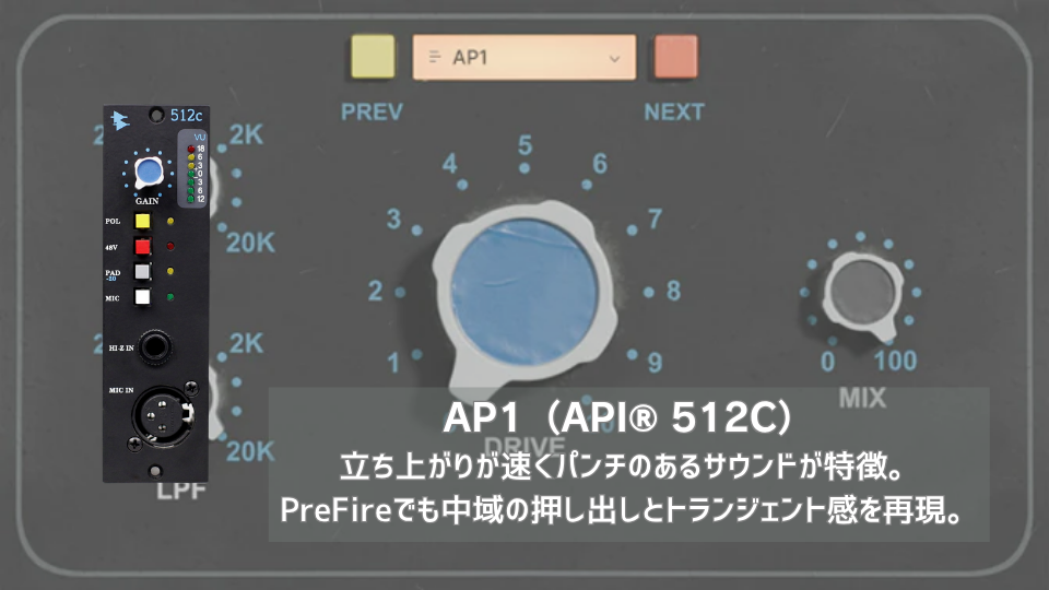 | API® 512Cは、米API社の定番500シリーズマイクプリアンプで、パンチのあるアグレッシブなサウンドで知られている。 | PreFireのAP1モデルは、API 512Cの攻撃的なパンチをしっかりと再現している。 |