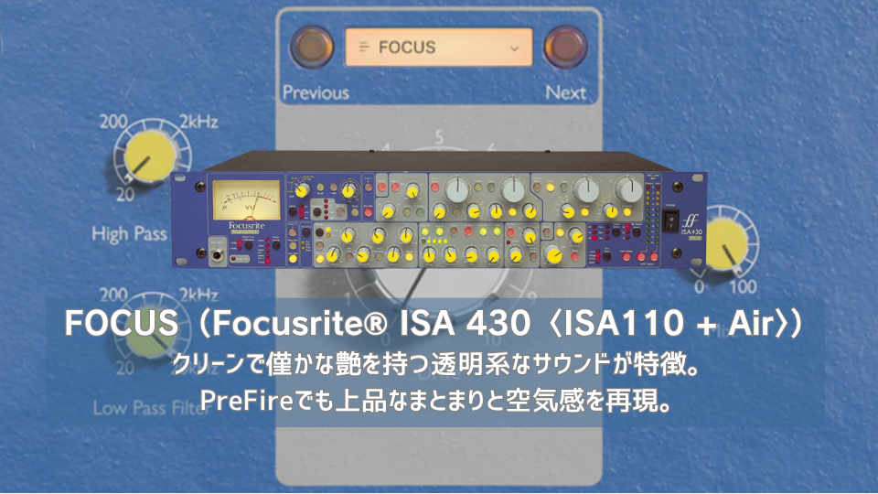 | Focusrite® ISAシリーズは、ルバート・ニーヴ設計のFocusrite Forteコンソール由来のマイクプリアンプ。 | PreFireのFOCUSモデルは、Focusrite® ISAプリアンプの持つクリーンで上品な響きを巧みにエミュレートしている。 |