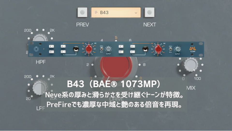 | BAE® 1073MPは、ヴィンテージNeve® 1073プリアンプを現代に忠実に復刻するBAE社のモノラルマイクプリ。 | PreFireのB43モデルは、BAE® 1073MP / Neve® 1073の芳醇なサウンドを極めて高い精度で再現している。 |