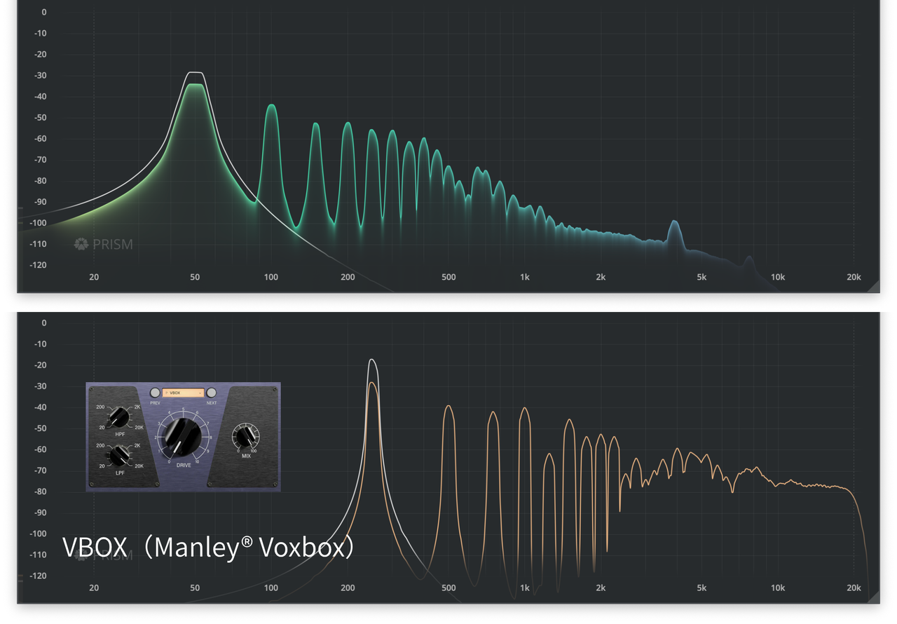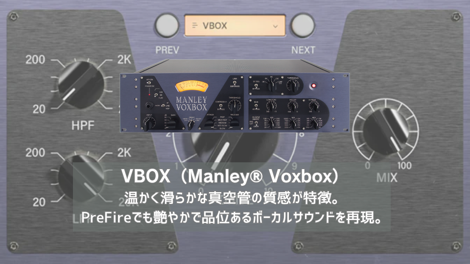 | Manley® VoxBoxは、高品質なオールチューブ回路で構成されたチャンネルストリップで、特にボーカル用途に最適化されている。 | PreFireのVBOXモデルは、Manley® VoxBoxの唯一無二のチューブキャラクターをしっかり再現している。 |