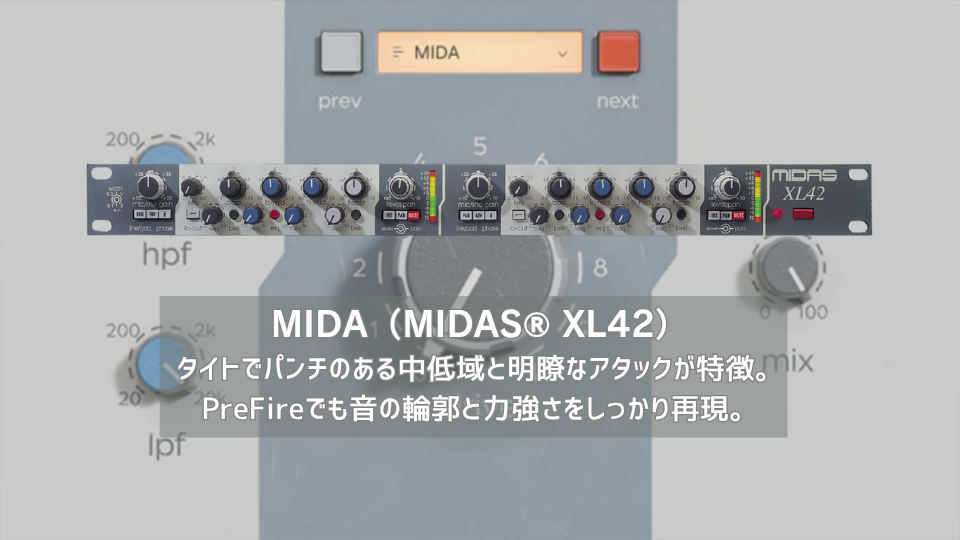 | Midas® XL42は、名門ライブコンソール Midas® XL4のプリアンプとEQ部分をラックマウント化したユニット。 | PreFireのMIDAモデルは、Midas® XL42プリアンプのパンチと明瞭さをしっかりと再現している。 |