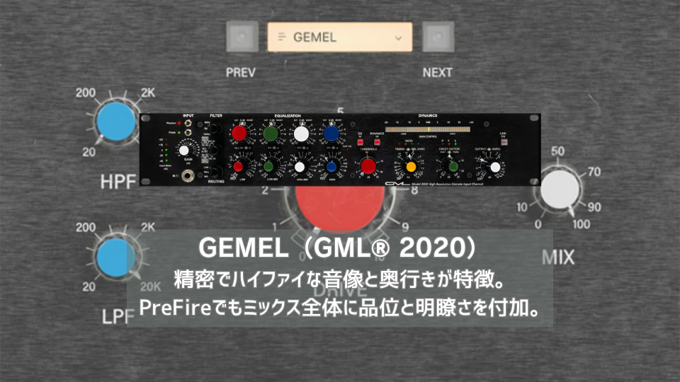 | GML® 2020は、ジョージ・マッセンバーグ氏が手掛けた伝説的な機材で、GML® 8300マイクプリ、8200イコライザ、8900コンプレッサを1筐体に収めた超高解像度チャンネルストリップ。 | PreFireのGEMELモデルは、GML® 2020プリアンプの超高精度サウンドを見事に捉えている。 |