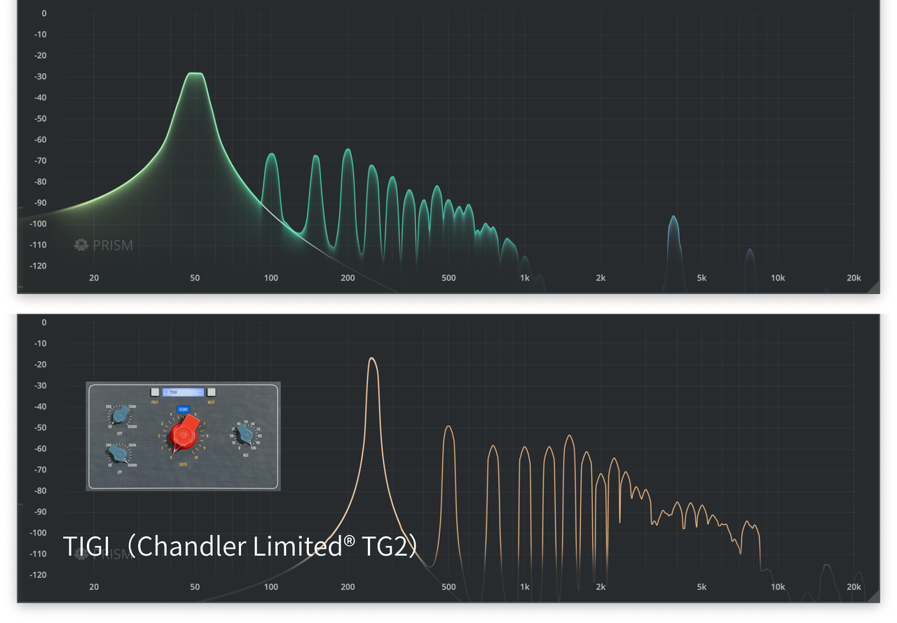 | 高域はNeve® 1073よりも開放的で「輝かしくクリーミー」との声もある。 | Neve系モデルと比べて、TIGIは高域がもう少し開けて攻撃性があり、耳に残る倍音成分を付加する点で差別化されている。 |