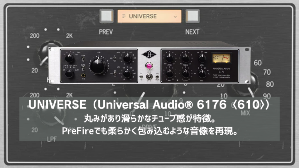 | UA 6176は、名機UA 610チューブプリアンプと1176コンプレッサーを組み合わせたチャンネルストリップで、特にUA 610チューブプリ部分の豊かでまろやかな真空管サウンドが焦点。 | PreFireのUNIVERSEモデルは、UA 610のチューブプリサウンドをかなり忠実にエミュレートしている。 |