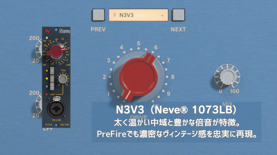 | ヴィンテージなClass Aマイクプリアンプの代表格。 | PreFireのN3V3モデルは、Neve® 1073特有の「色気のある」サウンドを忠実に再現している。 |