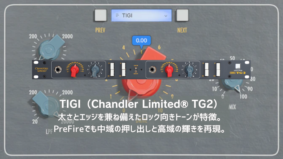 | Chandler® Limited TG2は、アビーロードスタジオの名機EMI TGコンソールのマイクプリアンプを復刻・改良した製品。 | PreFireのTIGIモデルは、Chandler® TG2の持つ厚みとエッジのバランスを巧みに再現している。 |